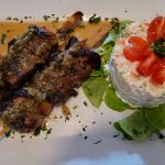 Gebratenes Lammsteak auf Waldfruchtsoße mit Kartoffeln.